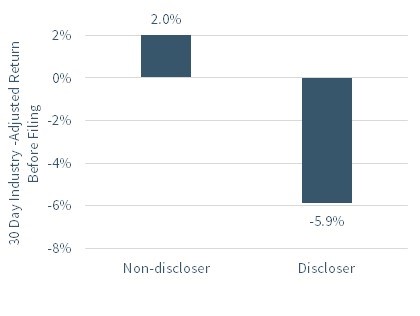 Companies that disclosed COVID-19 impact in March experienced a more negative stock price performance prior to that disclosure. While most companies experienced sharp share price declines in March, companies that issued COVID-19 related disclosure in March experienced 30-day stock price declines that were significantly more negative than companies that did not disclose in March (-22.5 percent versus -12.5 percent). On an industry-adjusted basis, companies that disclosed COVID-19 impact in March experienced a 5.9 percent decline prior to the disclosure while those that made no disclosure in March experienced an industry-adjusted 2.0 percent increase. This data suggests companies that performed worse were more likely to disclose the virus’ impact, potentially because of greater exposure and risks (see Exhibit 7).