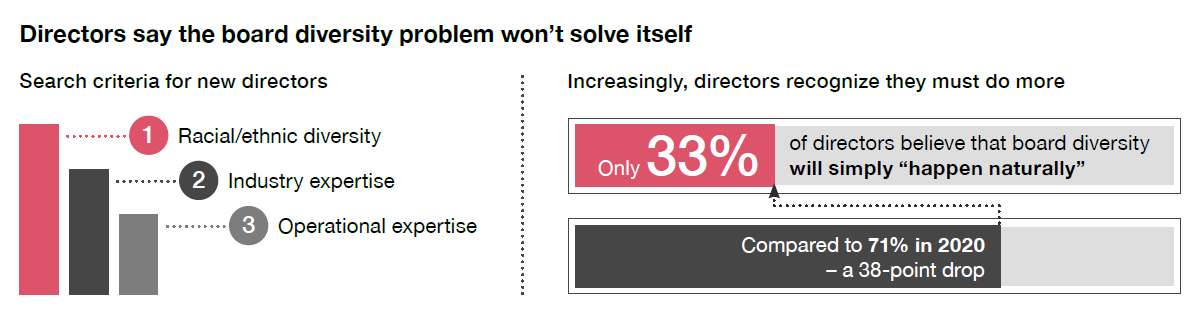 These changes have had broad impacts on companies, from their employee base to the executive suite—and up to the boardroom. Boards are historically slow to change, in part because they are relied upon as a stabilizing force for corporations. But as the world is changing, directors are driven to change their playbook as well.