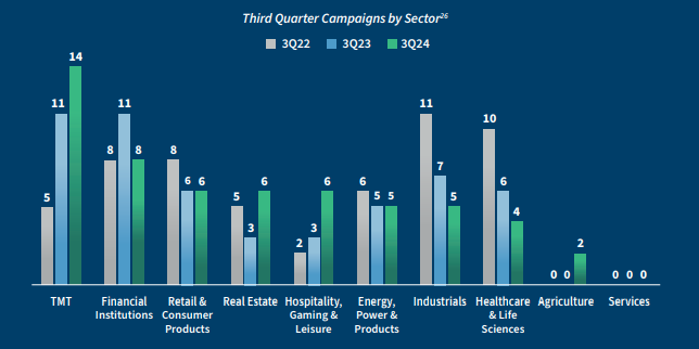 As the year draws to a close, there is a growing sense of optimism for M&A activity in 2025, with an anticipated change in the regulatory environment following the elections – one that market commentators believe will be less restrictive. A friendlier M&A backdrop could underpin a pickup in the number of activist campaigns in 2025. For the nine-months ended September 30, 2024, there have been 40 activist campaigns with explicit demands for M&A, up 17% over the same period in the prior year, suggesting the optimism may begin to materialize. [1] Technology, Media and Telecommunications (“TMT”) and Financials Institutions have been the most actively targeted sectors by activists year-to-date, and we believe that they are likely to remain vulnerable to activists in the coming year.