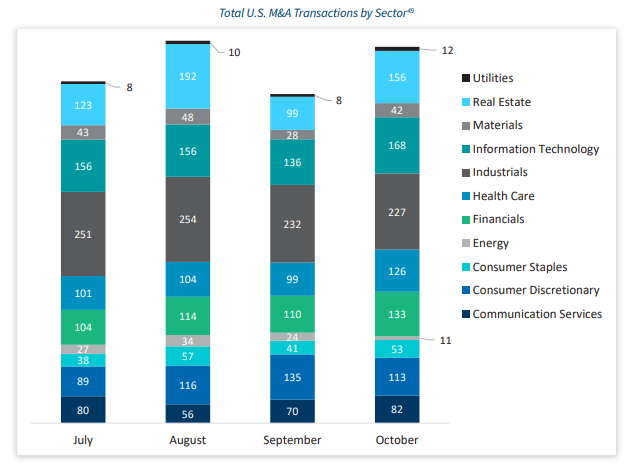 The third quarter revealed notable shifts in transaction activity across sectors. Health Care saw an 8% year-over-year decline in deal volume, with Financials experiencing an even sharper drop of nearly 15%. In contrast, Communication Services stood out with an 11% increase over the same period. Meanwhile, the most active sectors, Industrials and Information Technology, remained steady, showing little change from last year. [51]