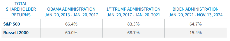 Last month’s election saw Republicans gain control of the U.S. Presidency, the U.S. Senate and retain its slim majority in the U.S. House of Representatives. Historically, Republicans have been perceived as friendlier toward investors and business. While longer term evidence is mixed, both the S&P 500 and the Russell 2000 generated a stronger TSR during the first Trump Administration than during either Democratic-led administration surrounding it.