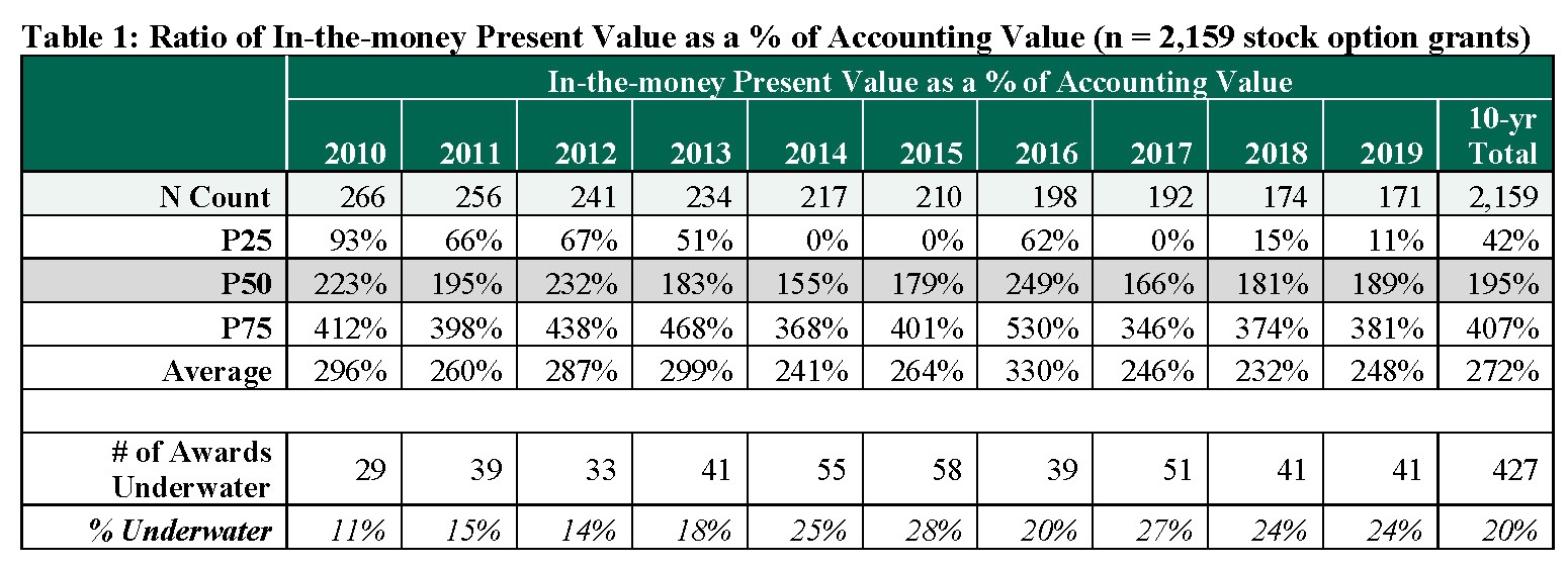 Our research shows that the grant date accounting value (e.g., Black-Scholes value) is significantly lower than the future in-the-money value of most stock options. This is a unique topic of research in the executive compensation field.