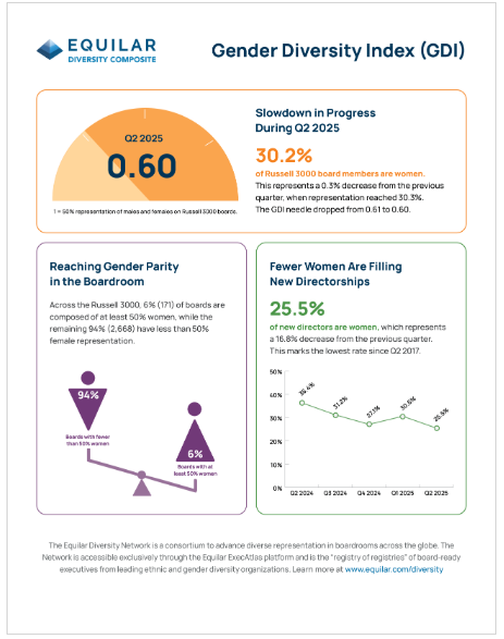 Gender diversity on corporate boards showed signs of stagnation in the second quarter of 2025. The latest Equilar Gender Diversity Index (GDI) sits at 0.60, where 1.0 represents gender parity between men and women across Russell 3000 boards. This marks only a slight change from Q4 2023, when the GDI measured 0.59. Other than a brief increase to 0.61 last quarter, the needle has held steady at 0.60 since Q1 2024.