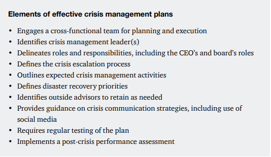 With crises becoming more complex and frequent, a crisis response plan is likely to need ongoing attention. The board will want to do its part in keeping this topic on the forefront by periodically putting crisis oversight on its agenda. The board will want to not only get an update from management on the current crisis plan but also feedback on how the plan is continuing to be tested and what additional training and follow-up actions have been identified to improve the plan.