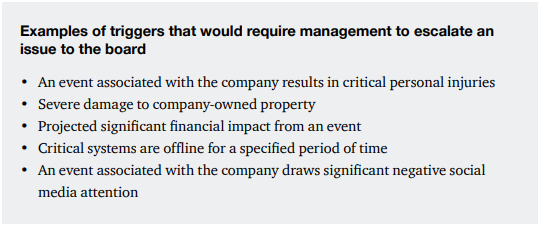 An essential part of timely notification to the board will be for the board and management to define a “crisis” as well as the quantitative and qualitative triggers that will cause notification considering a variety of possible scenarios with management that would require board involvement.