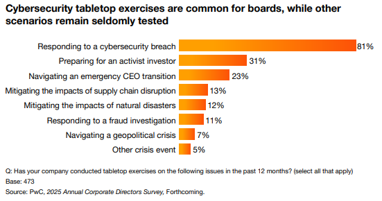 The board can ask management about the different scenarios that it used to simulate a crisis and test the plan. Of directors that say their boards have conducted tabletop exercises in the last 12 months, the majority (81%) of them have been focused on responding to a cybersecurity breach. However, other critical crisis scenarios — such as mitigating the impacts of supply chain disruptions, addressing natural disasters and navigating geopolitical crises — have been less frequently tested. It’s essential to evaluate scenarios that differ from crises the company has already encountered. Continual testing of the plan helps the crisis team understand how well the company would respond in real time and whether roles and activities align with the plan’s intentions. Testing can help identify areas of confusion and reveal gaps in the crisis response plan.