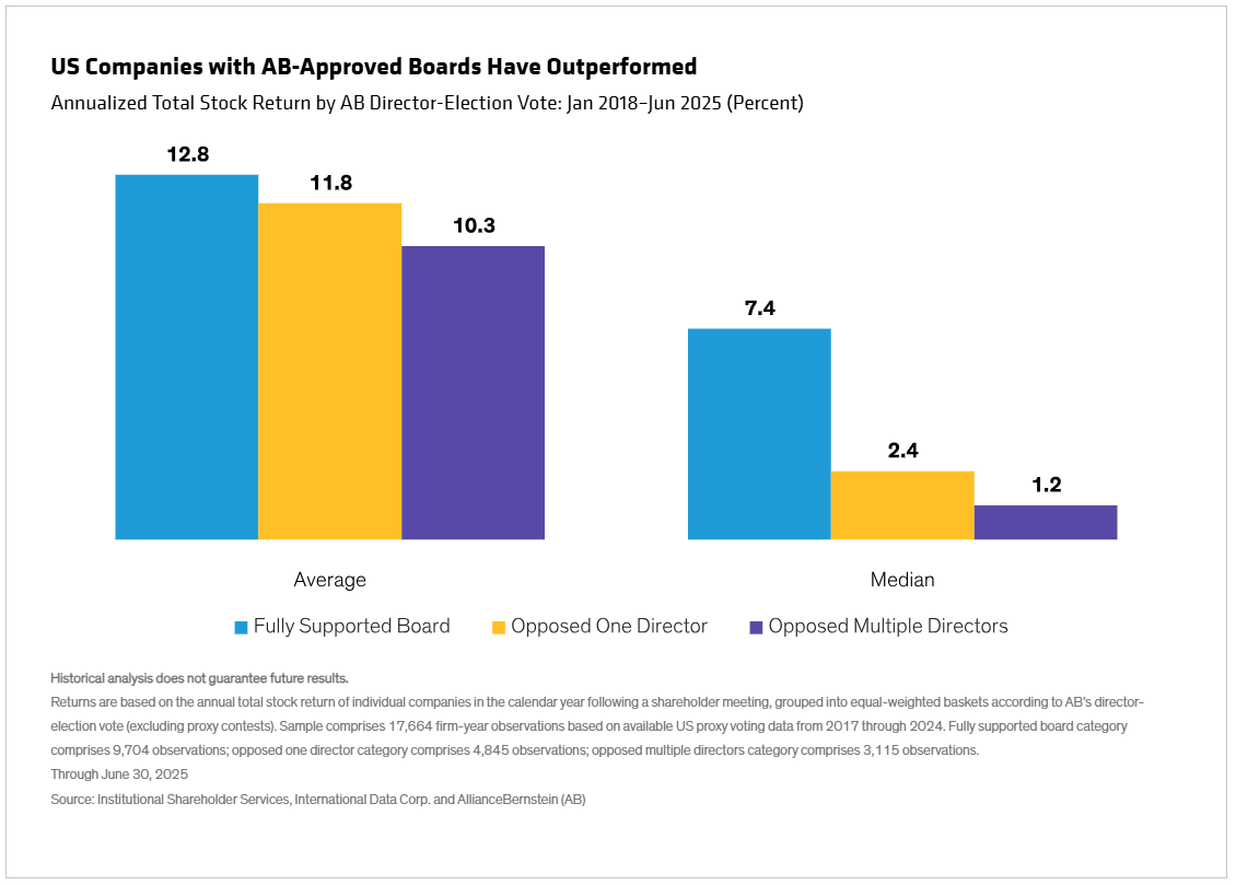 We believe that investors should stay focused on a simple question: Is the board delivering for shareholders? Our research shows a clear connection: disappointing boards tend to deliver disappointing results, while boards earning our full support historically outperformed in the following year.