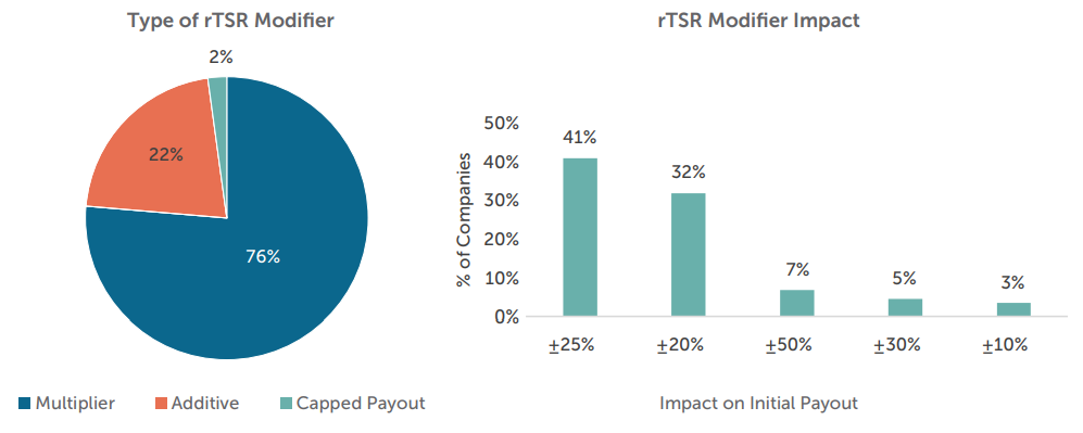 The choice between a weighted metric and a modifier reflects a company’s philosophy on pay-performance alignment. Weighted metrics make rTSR a central driver of payouts, appealing to investors who value direct market alignment. Modifiers keep rTSR in a secondary role, reinforcing other financial or strategic goals without overshadowing them. However, the downside to using rTSR as a modifier is that if results fall short due to the inability to plan with precision, there may well be no payout to modify. Companies choosing to have rTSR as the sole performance measure (22%) may have difficulty setting multi-year goals for financial metrics, and the use of rTSR alleviates this concern by serving as an objective assessment of long-term results.