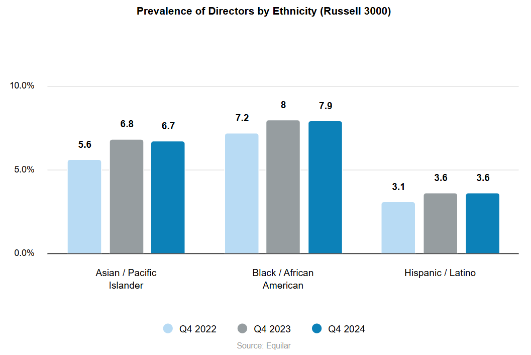 Although representation is not growing at a rapid pace, there have been small increases in the prevalence of ethnically diverse directors across Russell 3000 companies. Asian/Pacific Islander directors saw the largest increase in representation since the end of 2022, from 5.6% to 6.7% 2024, a 19.6% increase. By the end of 2024, Black/African American (7.9%) Russell 3000 board members were the most prevalent ethnic group, followed by Asian/Pacific Islander (6.7%) and Hispanic/Latino (3.6%).