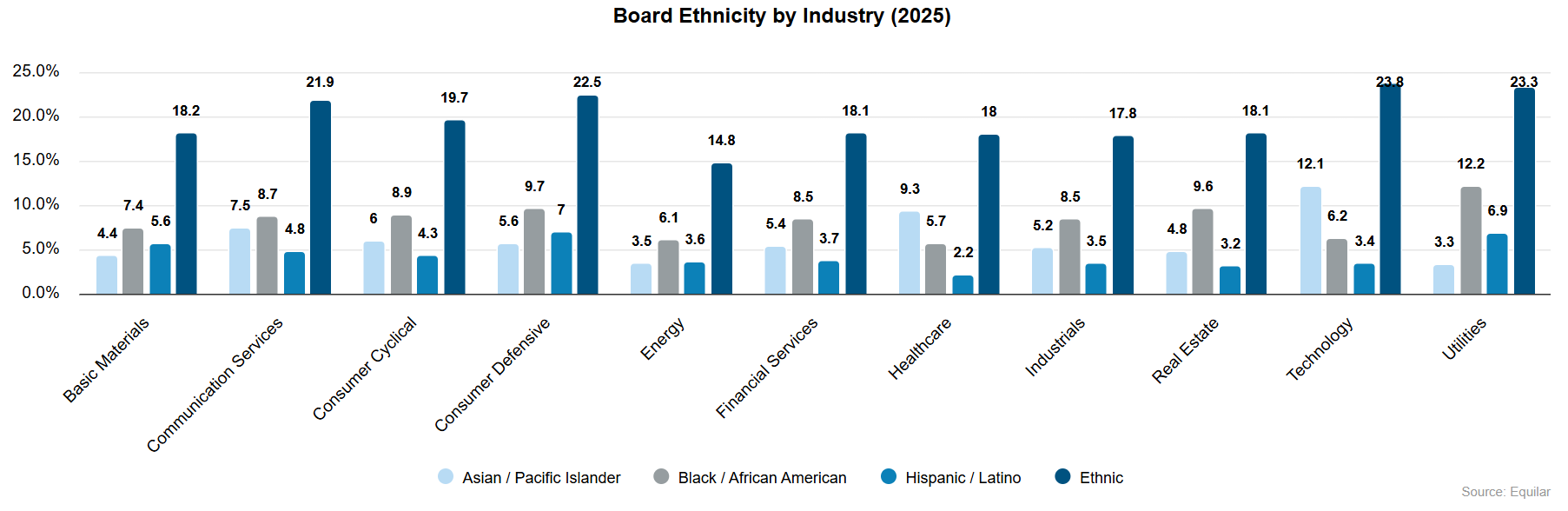 The utilities sector stands out for having the highest share of Black/African American directors at 12.2%—the strongest representation not only across sectors but also compared with other ethnic groups. Among sector-specific ethnic representation, technology leads at 23.8%, followed closely by utilities (23.3%) and consumer defensive companies (22.5%). By contrast, energy lags significantly, with just 14.8% of its board seats held by ethnically diverse directors.