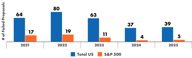 - U.S. say-on-pay support and the number of failed votes was stable year-over-year, remaining down from a spike in opposition from 2021-2023.