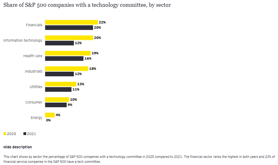 In the second quarter of 2025, the EY Center for Board Matters reviewed S&P 500 technology committee charters and proxy statements. Companies were chosen for their size, complexity and reputation as early adopters of board operational changes. The review also included in-depth interviews with directors and executives at 18 companies.