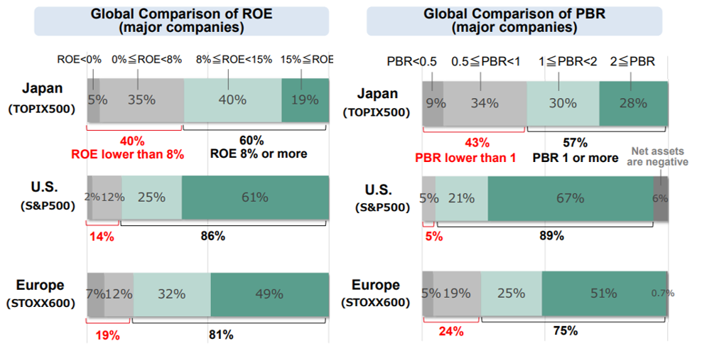 The primary objective of the market restructuring implemented in April 2022 was to encourage listed companies to enhance their corporate value. The restructuring itself, however, represented only the starting point. Even after the restructuring, indicators of capital efficiency and valuation, such as return on equity (ROE) and price-to-book ratio (PBR), which serve as representative benchmarks, lagged behind those of developed global market peers. This underscored the necessity for listed companies to voluntarily engage more actively in their initiatives aimed at improving corporate value.