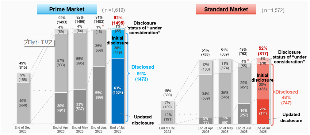 At present, nearly all companies listed on the Prime Market have responded to the Request. In light of this, TSE has shifted its focus from pursuing disclosure rates alone to addressing the qualitative aspects of the responses. Investors, both domestic and international, have pointed out that while many companies have technically “disclosed,” the quality of disclosure varies significantly. In many cases, disclosures are perceived as perfunctory or lacking the depth of analysis and planning that investors expect. To ensure that company responses are truly meaningful from an investor’s perspective, TSE has introduced several supplementary measures.