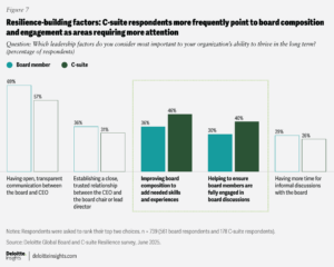 Respondents, therefore, rank other activities as lower in priority, including ensuring varying skills and experience within the board (29%), cultivating a culture of psychological safety and open communication (24%), and aligning CEO performance metrics with resilience goals (23%). This could indicate that, because board agendas are often so packed right now, it may be difficult to spend enough time across the spectrum of activities needed to drive resilient growth. It also suggests that chairs and boards may want to explore the breadth of their focus and activities to help ensure that important aspects are not overlooked or de-prioritized too extensively.