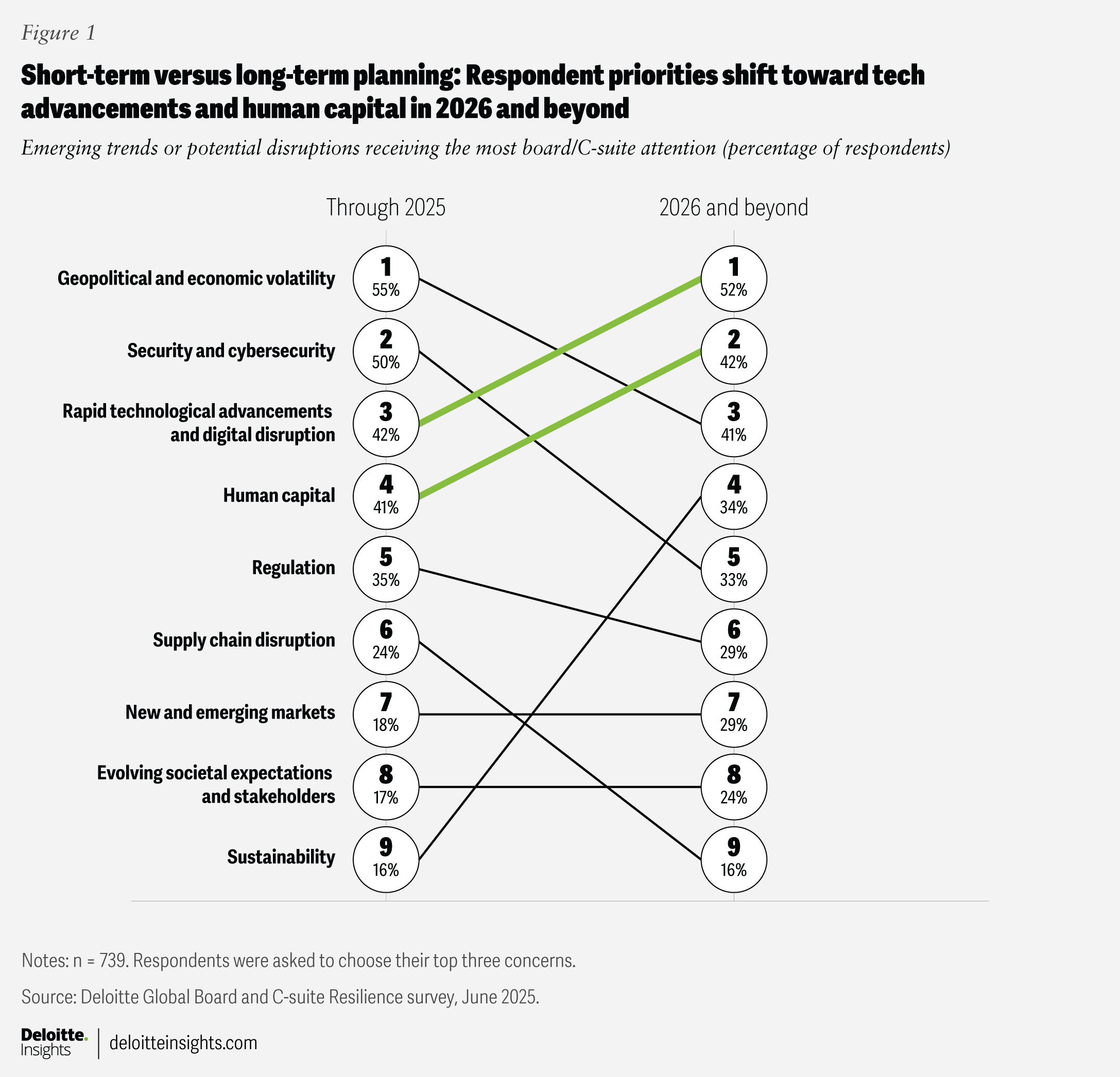 In the short term, through 2025, survey respondents say they’re focused most on geopolitical and economic volatility (55%), security and cybersecurity (50%), and rapid technological advancements and digital disruption (42%). And although human capital ranks fourth, at 41%, it’s a top near-term concern for a sizable number of respondents as well (figure 1).