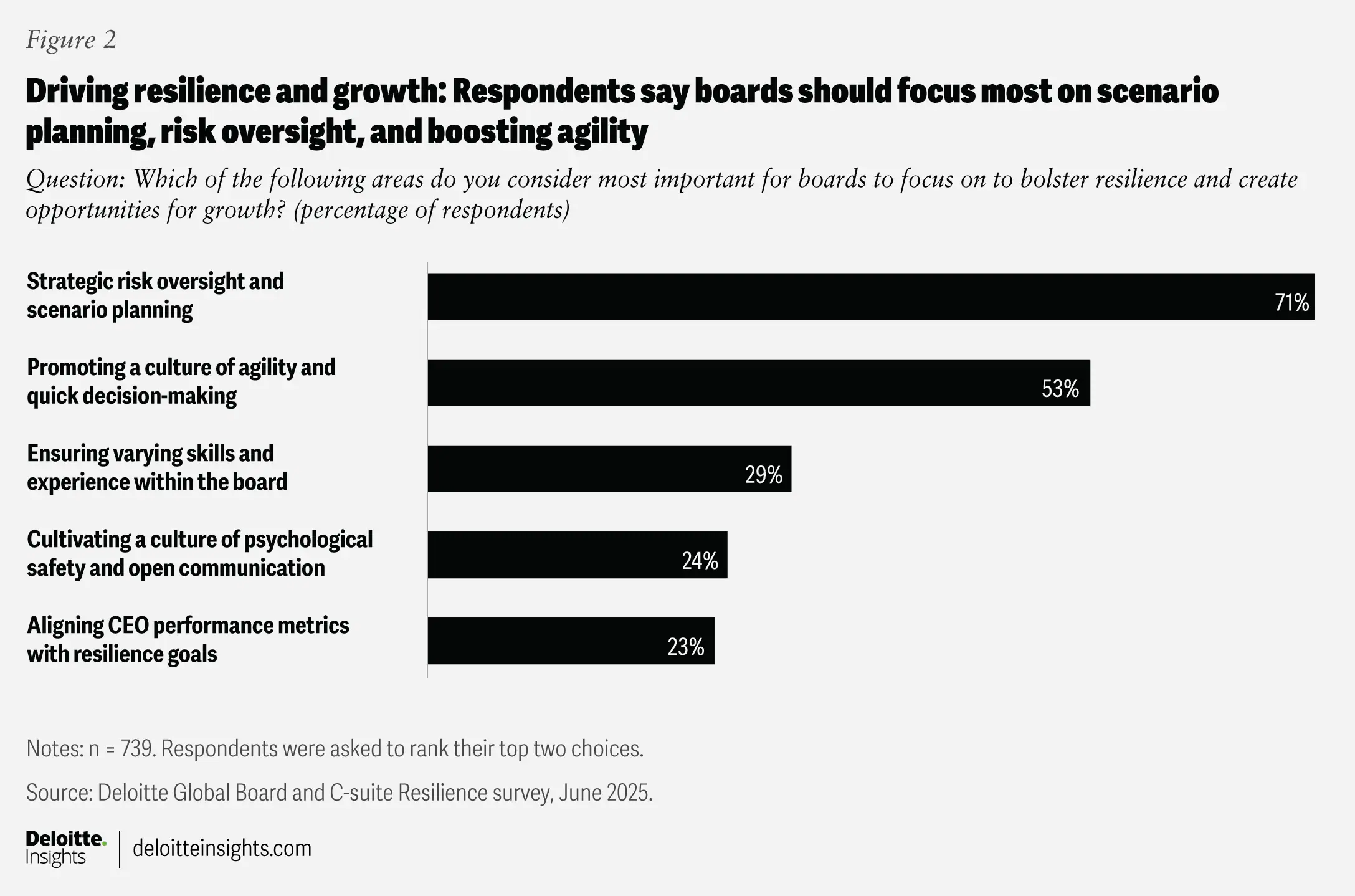 Our survey shows that boards are actively focusing on several dimensions to help build resilience, particularly on risk management and scenario planning. Most respondents (86%) say their boards have increased activity to monitor risk, oversee growth strategies, and bolster longer-term resilience, with 39% saying they’ve increased their efforts on those fronts significantly. So far, their focus areas have been strategic risk oversight and scenario planning (71%) and promoting a culture of agility and quick decision-making (53%) (figure 2).