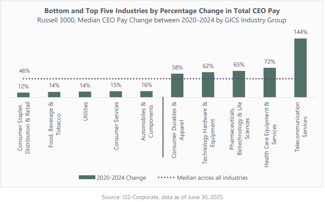 On an industry level, trends varied significantly, with some seeing sharp increases in pay while others remained mostly flat. CEO pay at Telecommunications Services has surged by 144% since 2020 to $9.4 million compared to the median pay increase of 46% across the Russell 3000 including the S&P 500. By contrast, Consumer Staples CEOs experienced the smallest pay increase: only 12% since 2020 to $9.5 million.