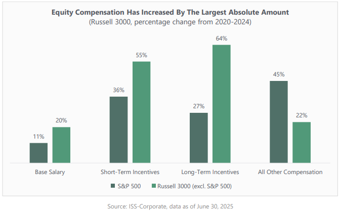 Median pay for CEOs reached all-time highs for both the S&P 500 and the rest of the Russell 3000. Over the past five years, CEO pay is up 26% in S&P 500 and 51% in Russell 3000. Growth was especially sharp in fiscal 2024, with median pay climbing 11% in the Russell 3000 to $5.6 million and 6% in the S&P 500 to $16.4 million.