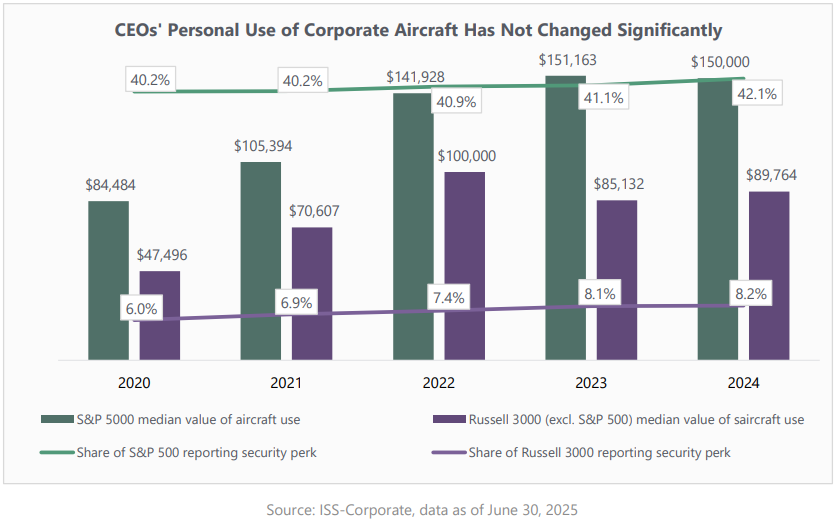 Personal use of company aircraft by the CEO is often the highest value perk, often receiving scrutiny from investors and the public. However, many companies disclose aircraft use not so much as a perk but as a necessary security measure sometimes recommended by outside security consultants alongside enhanced home and personal security. However, the prevalence of these perquisites has grown only marginally: approximately 2% over the last five years for each index. The value of these perquisites also has largely plateaued since 2022.