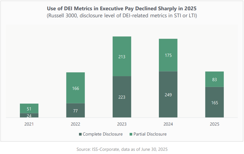 - Dramatic declines in the usage of DEI and climate-related metrics after a period of rapid adoption in the past few years suggest a shift in corporate priorities and disclosure practices;