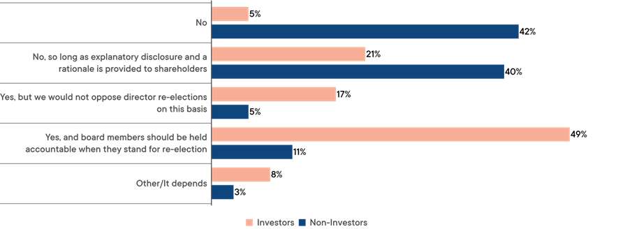 There appears to be a significant gap between investor and non-investor views on the adoption of these increased ownership thresholds without shareholder approval. Whereas a majority of investors found this concerning, with 49% stating that directors should be held accountable when they stand for re-election, 82% of non-investors did not find the practice to be concerning.