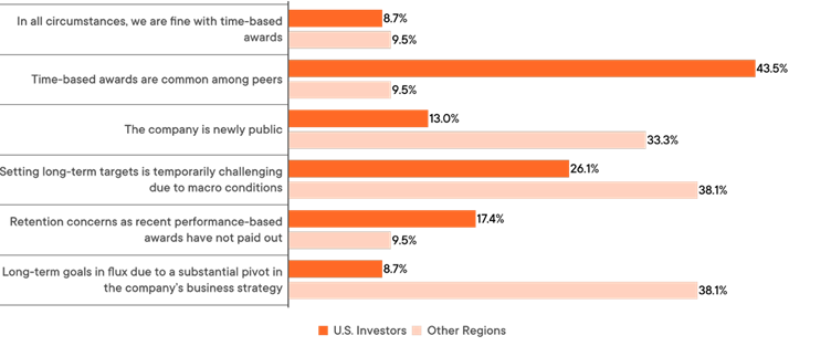 U.S-based investors were far more open to the sole use of time-based awards as a part of the ongoing compensation structure so long as the practice was common with peers (43.5%, compared to 9.5% among investors from other regions) or as a retention measure (17.4% vs 9.5%). Meanwhile, investors from other regions appeared more likely to view them as a temporary stopgap, such was when the company is newly public (33.3%, compared to 13% among U.S. investors) or following a significant change in business strategy (38.1% vs 8.7%).