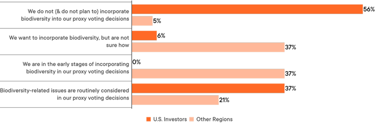 Three-quarters of non-U.S. investors are currently incorporating biodiversity into their stewardship program or plan to soon, and only 5% have no plans to. By contrast, only 8% of U.S. investors are looking into how to incorporate it, and 61% have no plans to do so.