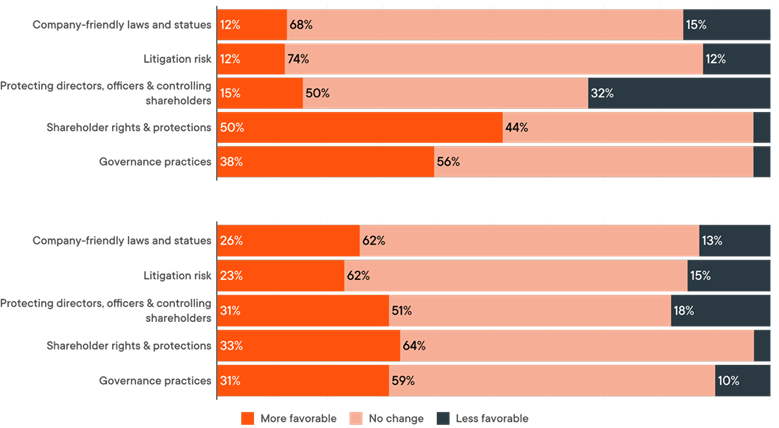 In response to this shifting landscape, half of investors reported that they are putting more emphasis on shareholder rights and protections (compared to just one-third of non-investors. Conversely, compared to investors, non-investors were over twice as likely to have become more favorable to company-friendly laws and statutes, litigation risk, and protecting directors, officers and controlling shareholders.