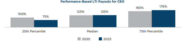Heightened market volatility is reflected in the broader range of performance-based LTI award payouts observed in 2025 compared to 2020. While median payouts in 2020 and 2025 are nearly identical, the interquartile range has widened, with the spread between 25th percentile and 75th percentile payouts increasing from a 65-point spread in 2020 to a 100-point spread in 2025.