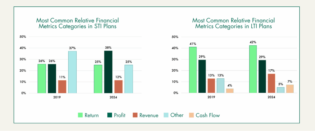 TSR is a common metric used in LTI plans among the S&P 500, with ~75% using the metric in 2024.[1] The use of relative TSR provides direct alignment with shareholder interests and is also advantageous from the standpoint of not having to set absolute financial goals. However, relative TSR can be influenced by factors outside of management’s control and provides less direct line of sight to the financial/operational goals the management team may need to focus on. Relative financial metrics, on the other hand, can provide direct focus to the management team on core financial measures in the company’s business plan while also avoiding the need to set goals in an uncertain environment. Our research shows that 3% of the S&P 500 utilized relative financial metrics in 2024 STI plans and 13% used them in LTI plans, which has generally held steady since 2019. The very low prevalence of relative financial metrics in STI plans may indicate that most companies have less difficulty in setting STI absolute goals at threshold, target and maximum performance levels; especially since goals generally align with annual business plans. Goal setting becomes even more challenging in LTI plans, as investor preference is for companies to adopt performance periods greater than 1 year.