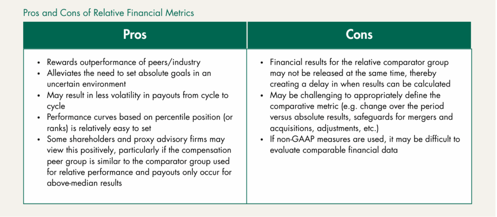 For companies facing uncertainty and difficulty in setting goals, the use of relative financial metrics can be another design feature to consider for LTI and/or STI plans with thoughtful discussion and planning. When planning, components for the Compensation Committee and management to deliberate on include: