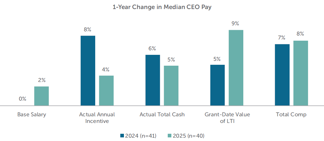 CEO pay increased in 2025. Median CEO total direct compensation – base salary plus actual bonus payout plus grant-date value of LTI – was up +8%. This increase was largely delivered in the form of LTI which was up +9% year over year. LTI awards are generally approved in the first quarter (i.e., September 2024 – January 2025 for Early Filers), and increases in award value are typically to recognize strong company and/or individual performance from the prior year. Long-term incentive pay eventually realized by CEOs may be higher or lower than the target amounts.