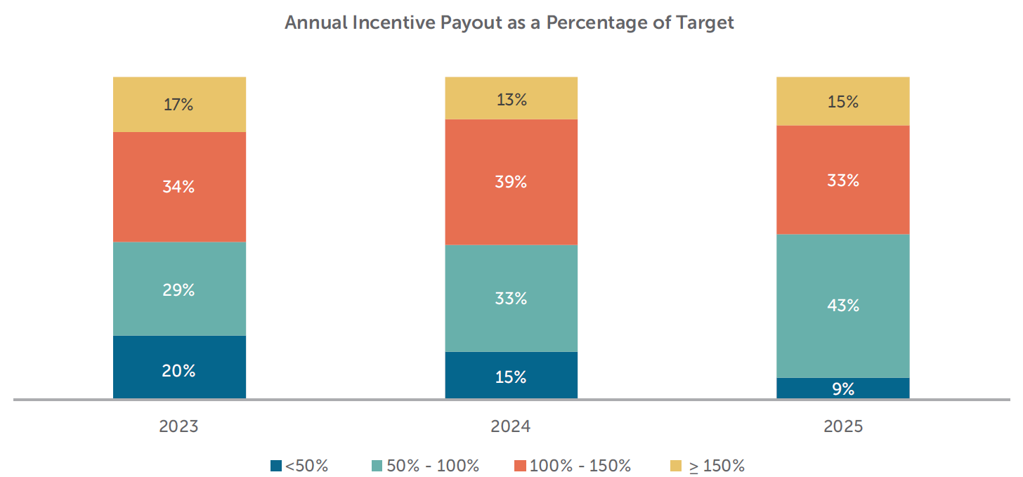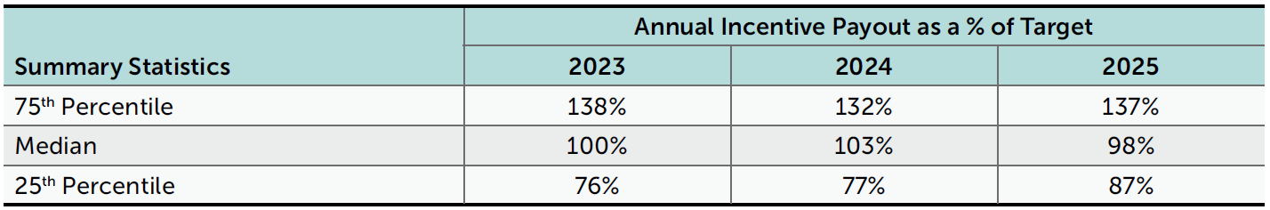 For a third year in a row, the median annual incentive payout was around target (98% in 2025). Median and 75th percentile payouts as a percentage of target were generally flat when compared to 2023 and 2024. However, in 2025, we saw a modest increase in the 25th percentile bonus payout (87% of target in 2025 vs. 77% of target in 2024 and 76% in 2023).