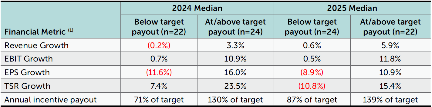 In contrast, companies with below target payouts experienced flat or declining financial results. The median payout for this group was 87% of target.