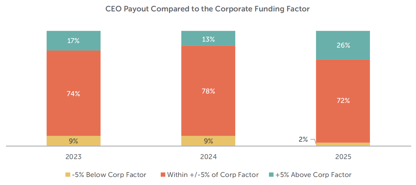 In 2025, about a quarter of companies increased the CEO’s payout above the corporate funding factor. The average increase ranged from 8 – 50 percentage points above the funding factor. Most of these increases were provided through an individual performance component although some companies did so through a discretionary adjustment. When a company provides a positive discretionary adjustment, it typically does not raise a below target payout to above target. Only one company reduced the CEO’s payout in 2025.
